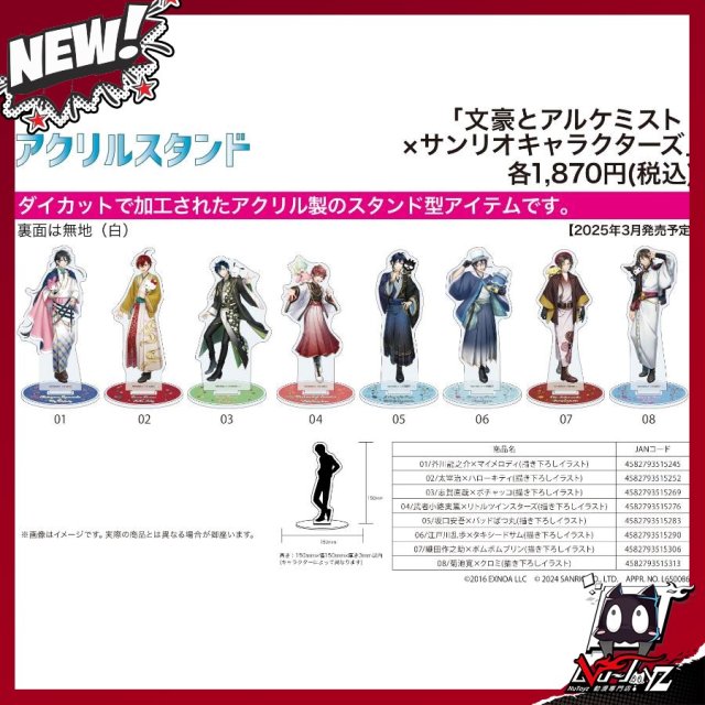 [訂購| 2025年3月内|日版| 截單2025/01/12]文豪與鍊金術師×SANRIO角色 亞克力立牌 (共8款)